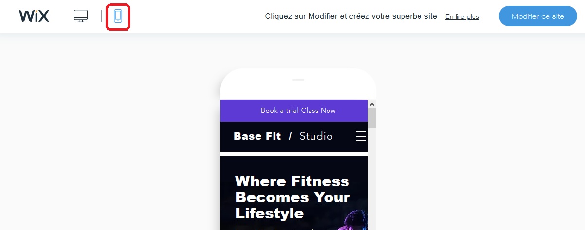 Image : bouton pour mettre en mode smartphone l'affichage du template Wix